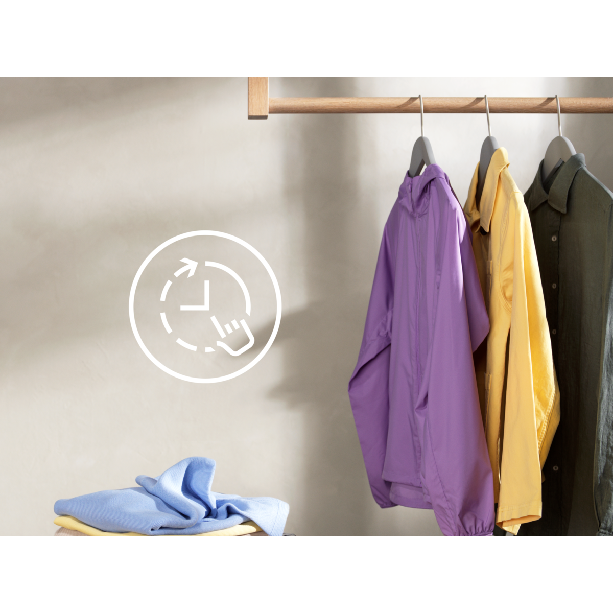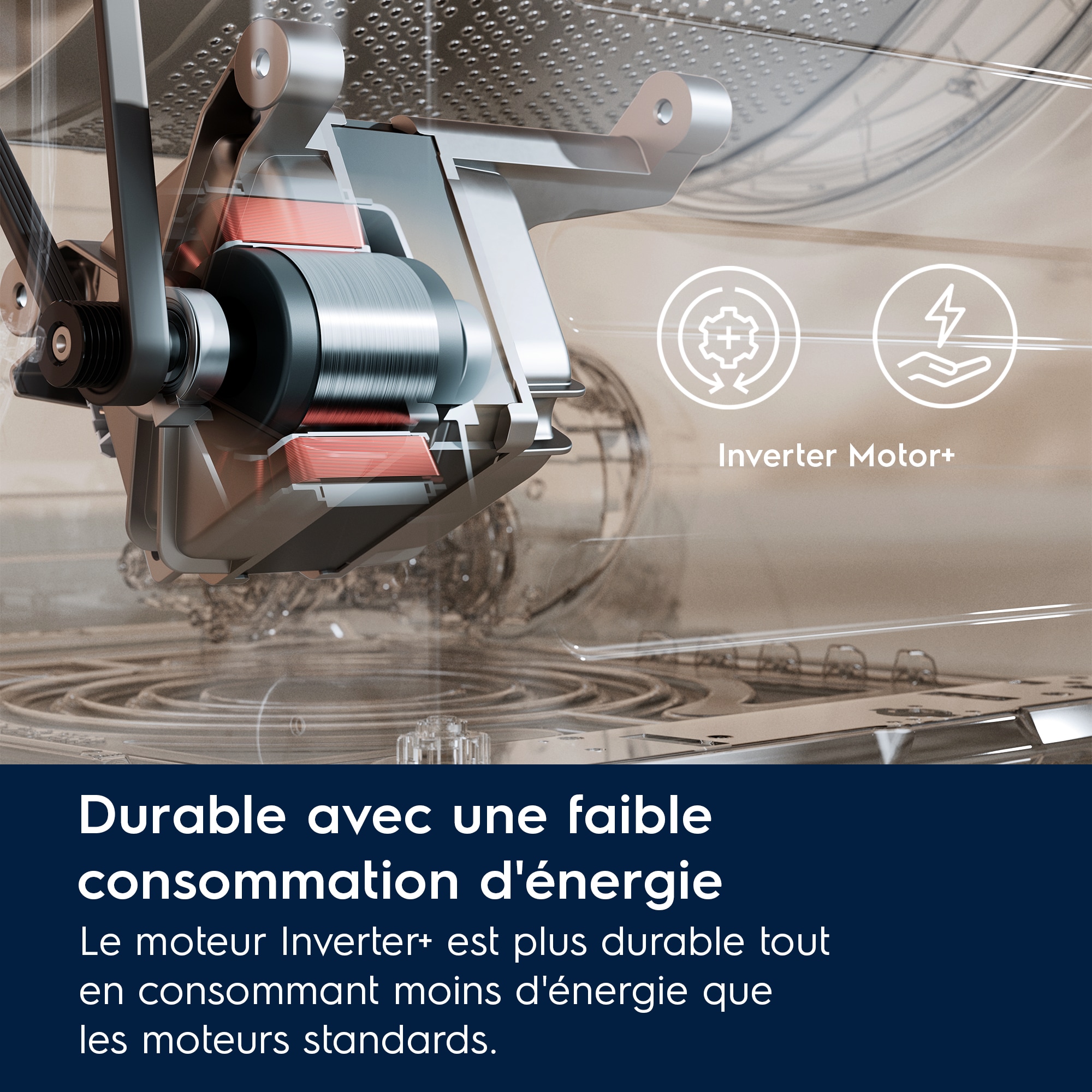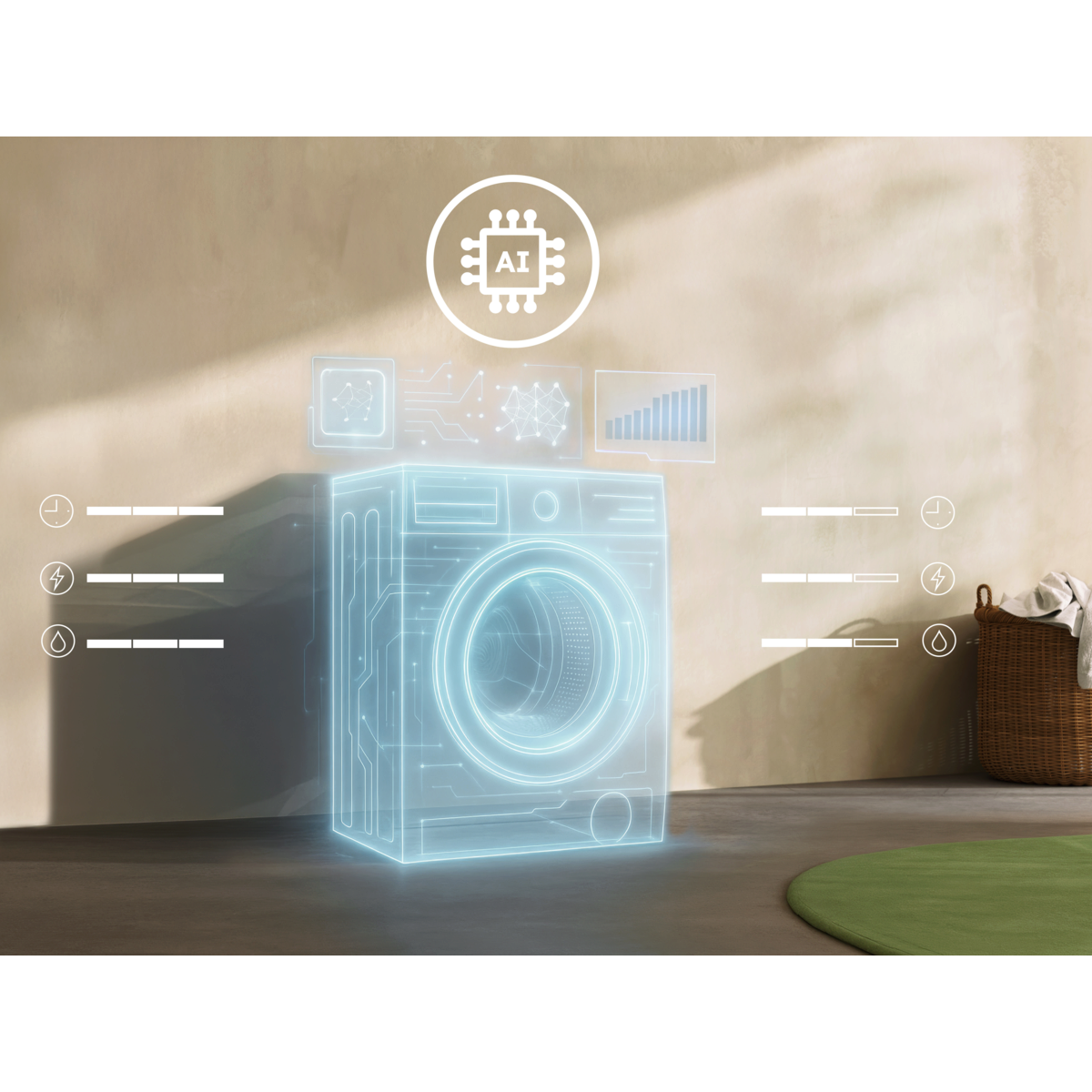 *Basé sur l’algorithme de détection du poids de la charge, pré-entraîné sur des charges. Aucune donnée utilisateur n’est utilisée pour entraîner l’IA. **Test interne sur le cycle Coton 30 °C optimisé avec AI WashAssist, comparant les consommations (temps, eau, énergie) entre 1 kg et charge maximale.