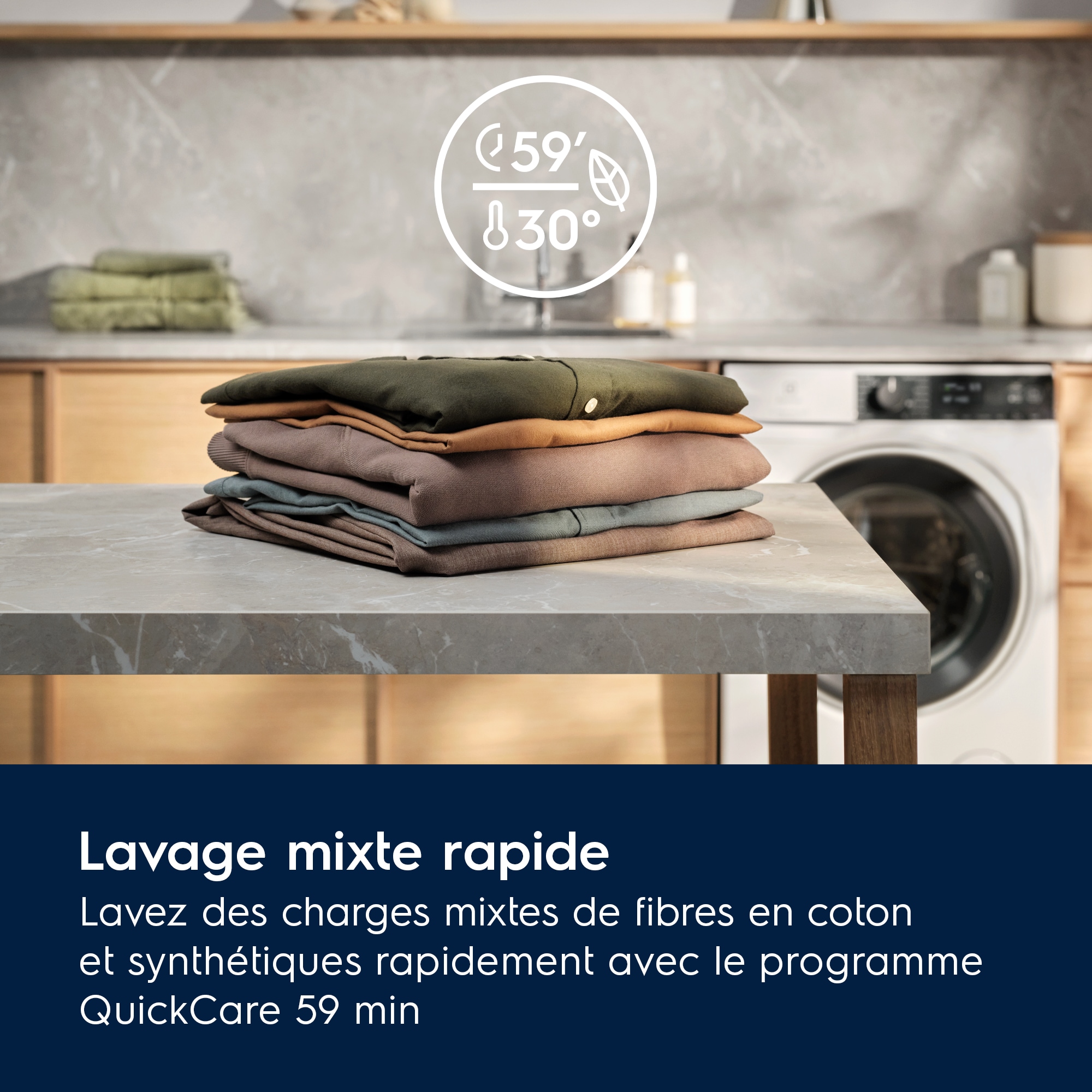 *Basé sur un test interne comparant la durée, la consommation d’eau et d’énergie pour un cycle coton à 30°C d’une charge de 1kg par rapport au même cycle avec une charge maximale, en utilisant SensiCare+ qui ajuste le programme en fonction du poids de la charge.