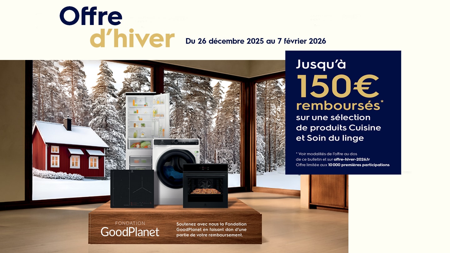 Du 26 décembre au 7 février 2026 bénéficiez jusqu'à 150€ de remboursement* sur une sélection de produits Electrolux de la gamme Cuisine et soin du linge, éligibles à l'offre dans les enseignes participantes (hors Electrolux.fr Amazon et Marketplace).