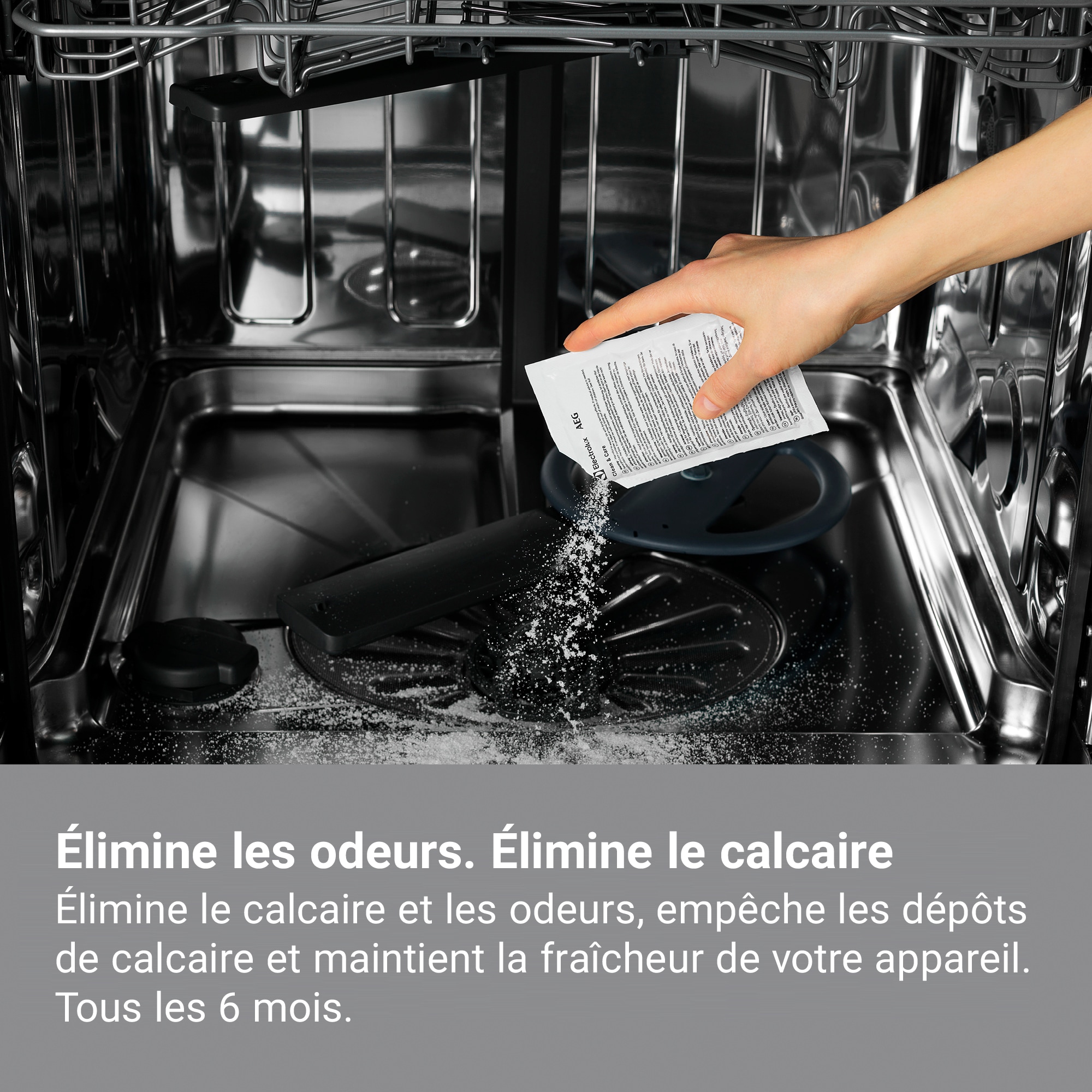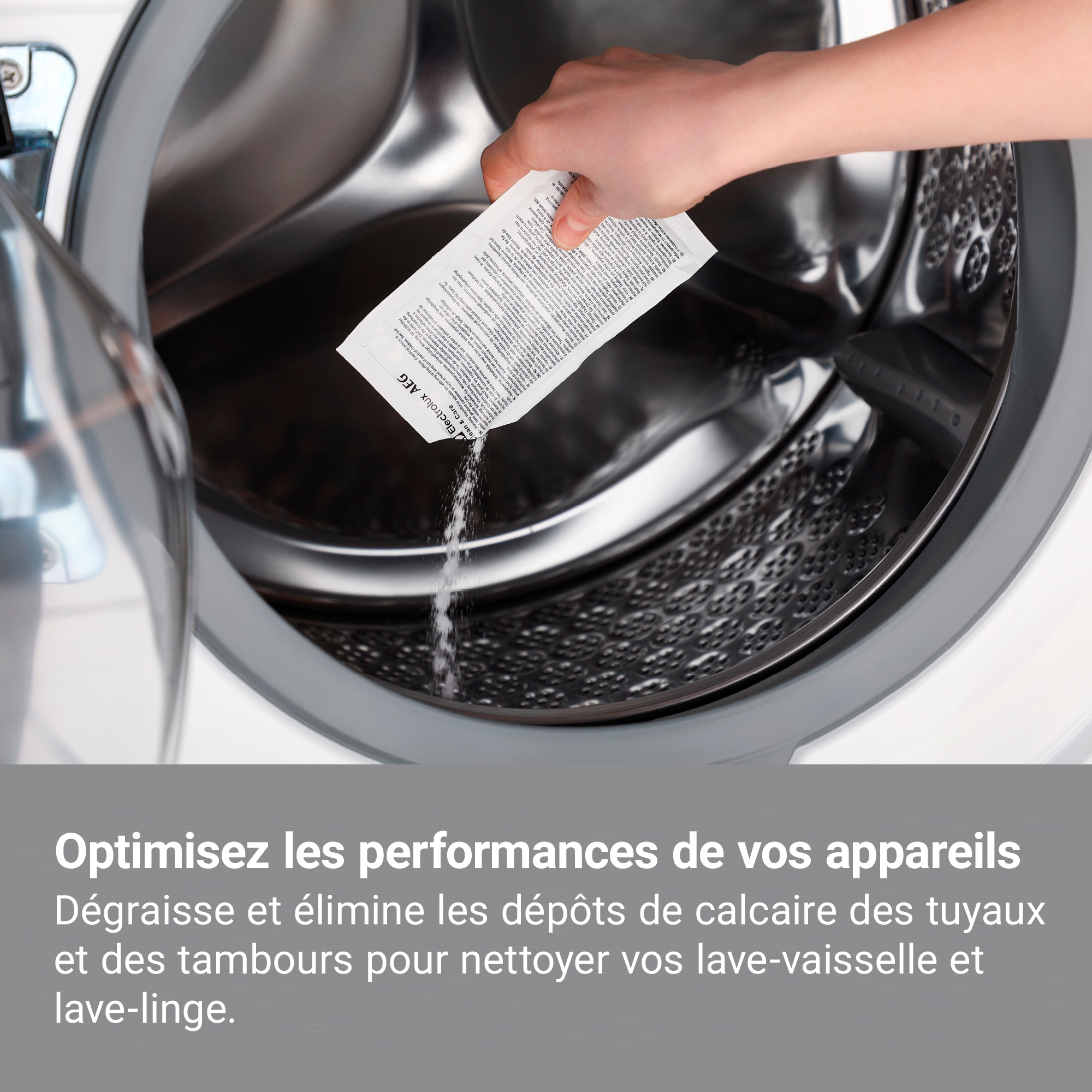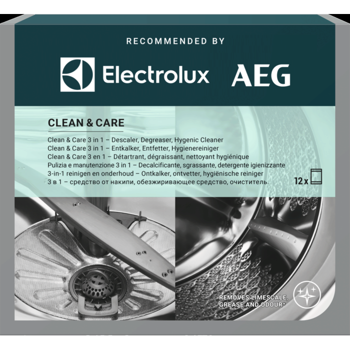 Notre produit Clean & Care 3 en 1 nettoie, dégraisse et détartre en profondeur votre lave-linge et lave-vaisselle. Il élimine les résidus de graisse, de calcaire qui peuvent s'accumuler avec le temps au niveau de la cuve, des tuyaux et du système de filtration, provoquant des odeurs et pouvant réduire les performances de lavage.
