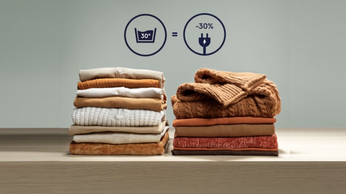 Grâce au programme UltraWash, vous nettoyez en profondeur à 30 °C et économisez plus de 30 % d’énergie par rapport à un programme coton à 40 °C.