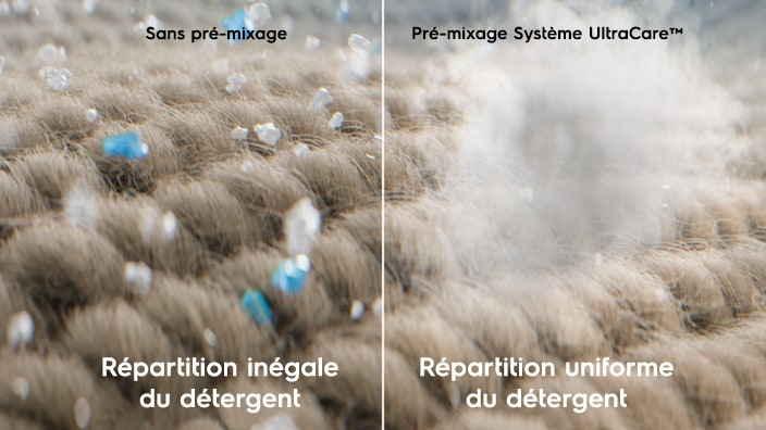 Le système UltraCare™ pré-mélange la lessive à l'eau en début de cycle et en fin de cycle l'assouplissant avant d'être injecté dans le tambour. La répartition des produits est donc plus efficace et homogène sur tous les textiles. Toutes les fibres restent douces lavage après lavage.
