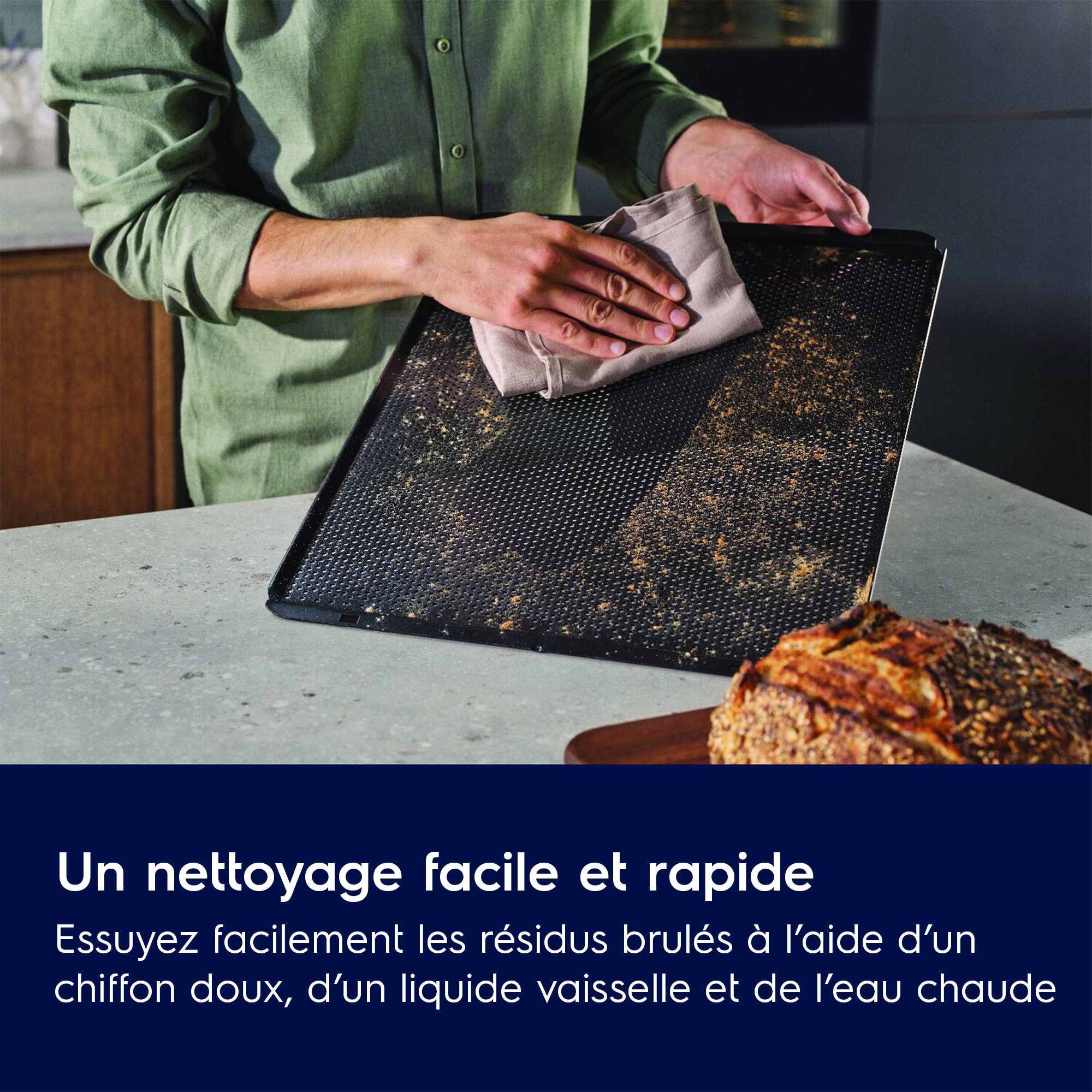 *Basé sur des tests internes comparant la plaque à pâtisserie perforée Easy2Clean à une plaque à pâtisserie traditionnelle non perforée.