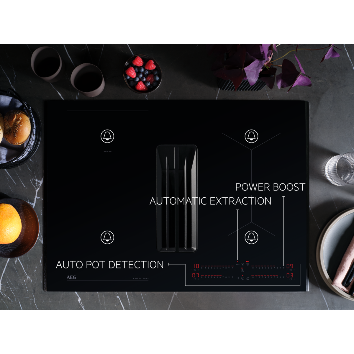 La plaque aspirante Série 6000 Bridge combine une plaque induction adaptée à un encastrement standard dans un meuble de 60 cm, avec une puissante hotte intégrée pour une évacuation optimale de l'air.
