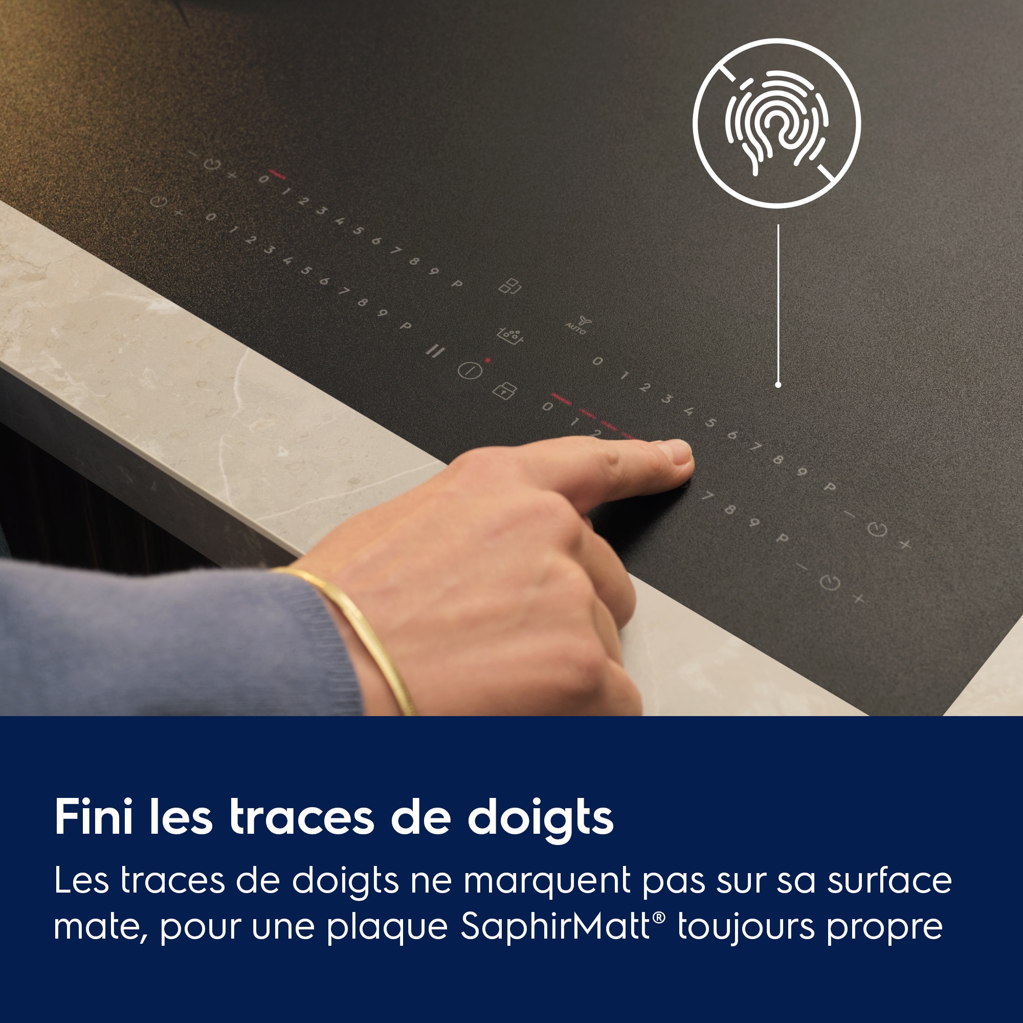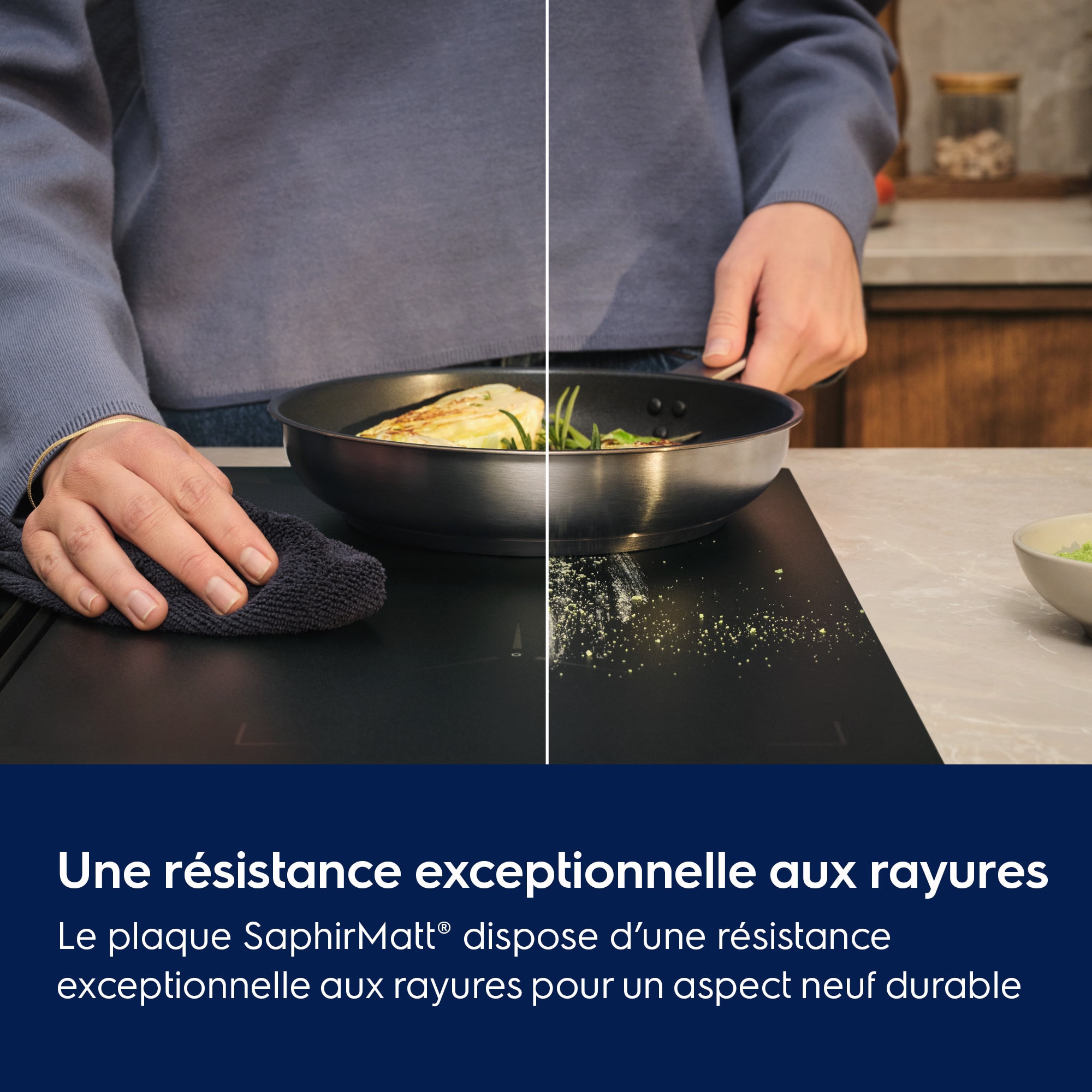 *Basé sur des tests d'abrasion réalisés par un laboratoire suisse externe conformément à la norme internationale CEI 60068-2-70. La visibilité des rayures est évaluée en interne par rapport à nos plaques vitrocéramiques standard sans traitement ni revêtement spécial.