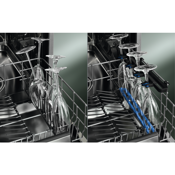 GlassCare Série 700 permet de prendre soin des verres grâce à SoftGrips et SoftSpikes présents sur le panier supérieur. Dans le panier inférieur, le GlassHolder garantit que même les grands verres à pied sont en sécurité.