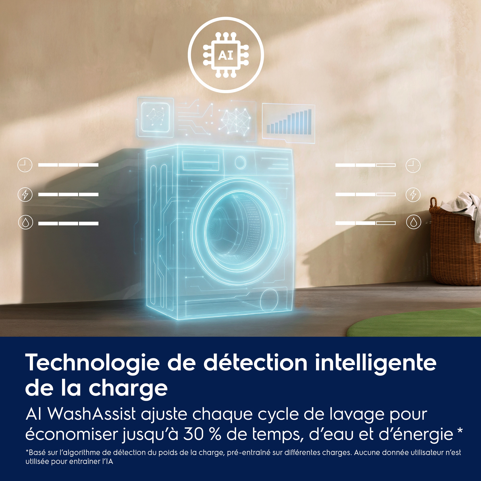 *Basé sur l’algorithme de détection du poids de la charge, pré-entraîné sur des charges. Aucune donnée utilisateur n’est utilisée pour entraîner l’IA. **Test interne sur le cycle Coton 30 °C optimisé avec AI WashAssist, comparant les consommations (temps, eau, énergie) entre 1 kg et charge maximale.