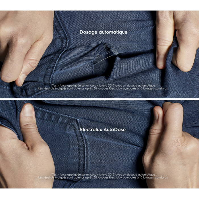 *Les capteurs intelligents AutoDose calculent la quantité précise de lessive et d’assouplissant en se basant sur la quantité réelle de vêtements, comparé à un dosage manuel qui est souvent basée sur la capacité de la machine.