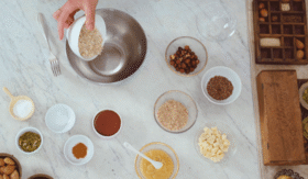 À l’aide d’une fourchette, mélangez les flocons d’avoine, les graines de lin et les graines de courge, les amandes en poudre, le sel, la levure chimique et la cannelle. Mélangez le miel avec la compote de pommes et ajoutez aux ingrédients précédents. Ajoutez les framboises, les noisettes et le chocolat blanc et mélangez bien.