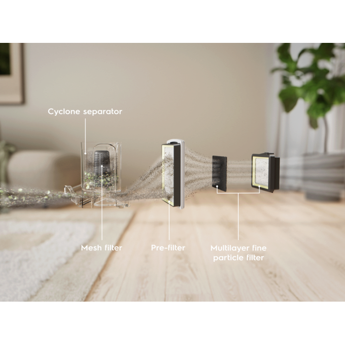 *D’après des tests internes de filtration de particules de micro-poussière de 0,3 à 10 microns selon la norme IEC62885-2:2021, 5.14 en utilisant des particules de sable/poussière standard